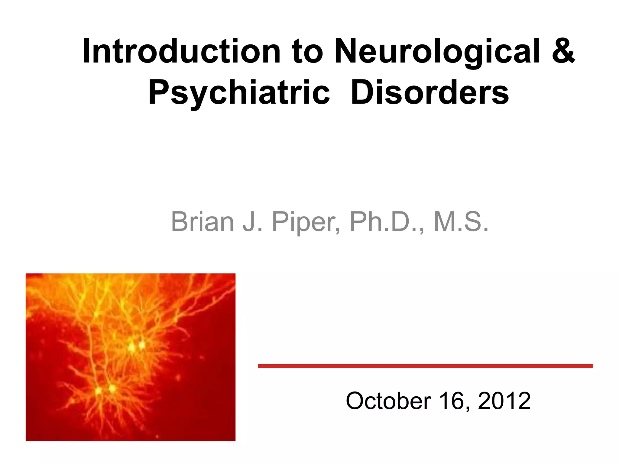 The document provides an overview of neurological and psychiatric disorders, contrasting the two fields through their historical foundations, diagnostic systems, and examples of various conditions. It discusses the evolution of classification systems like the ICD and DSM, highlights significant figures such as Philippe Pinel and Jean Martin Charcot, and addresses issues related to diagnosis and the genetic basis of disorders like schizophrenia. Additionally, it presents insights from neurobiology and animal models used in research to understand these conditions.
