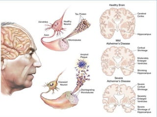 The document discusses the nervous system and its role in disease pathogenesis. It notes that the nervous system participates in the pathology of diseases through both defensive responses as well as becoming damaged itself. When damaged, the nervous system can become a source of harmful reflexes and disturbances in nervous activity are always reflected in the function of internal organs. Later sections discuss specific neurological disorders like Parkinson's and Alzheimer's disease.