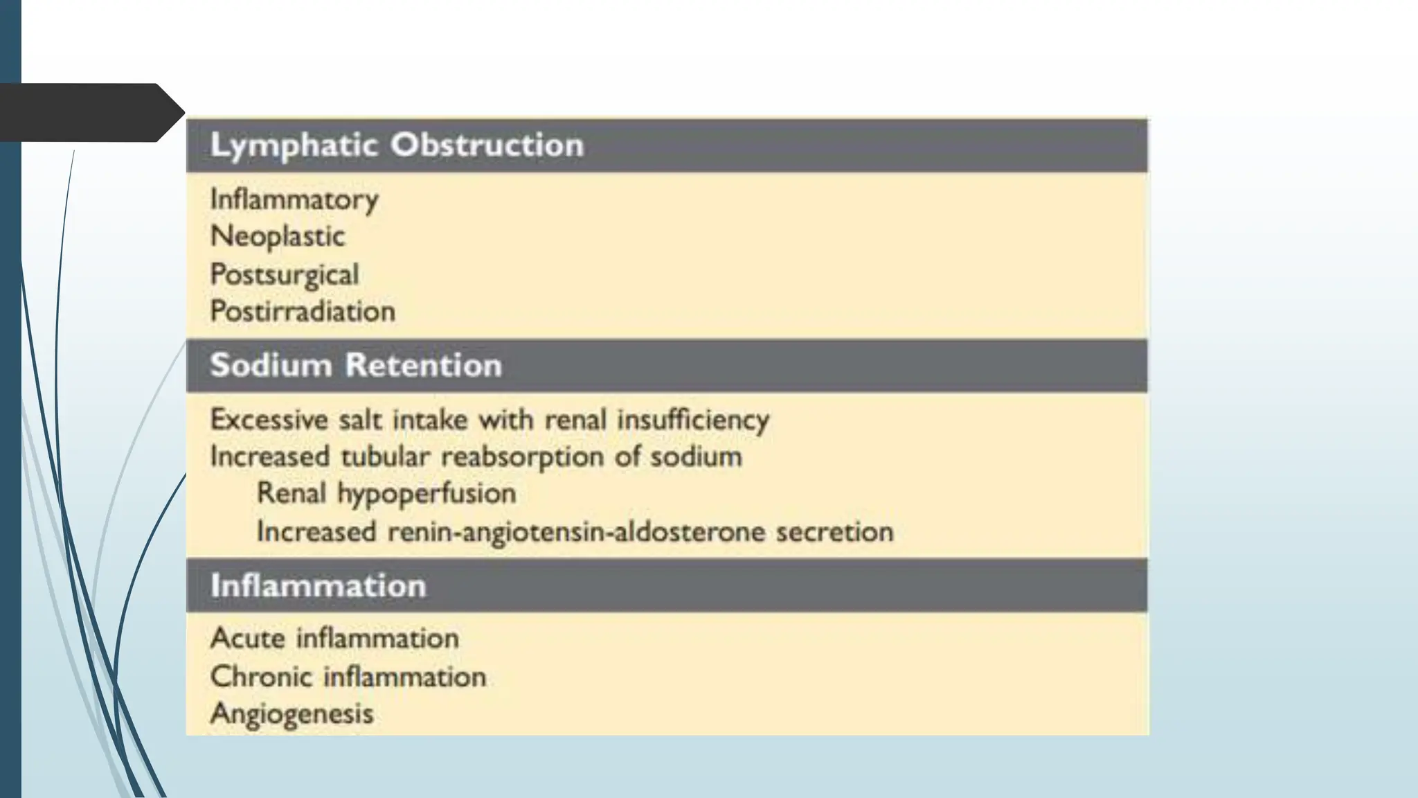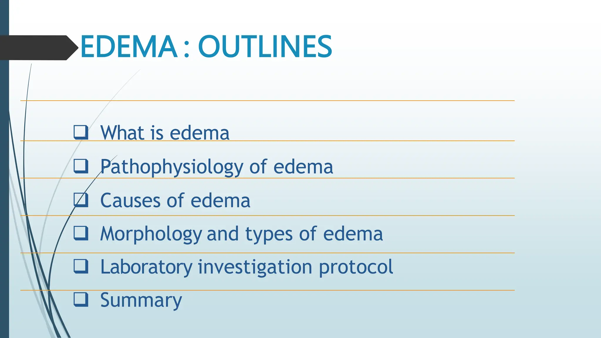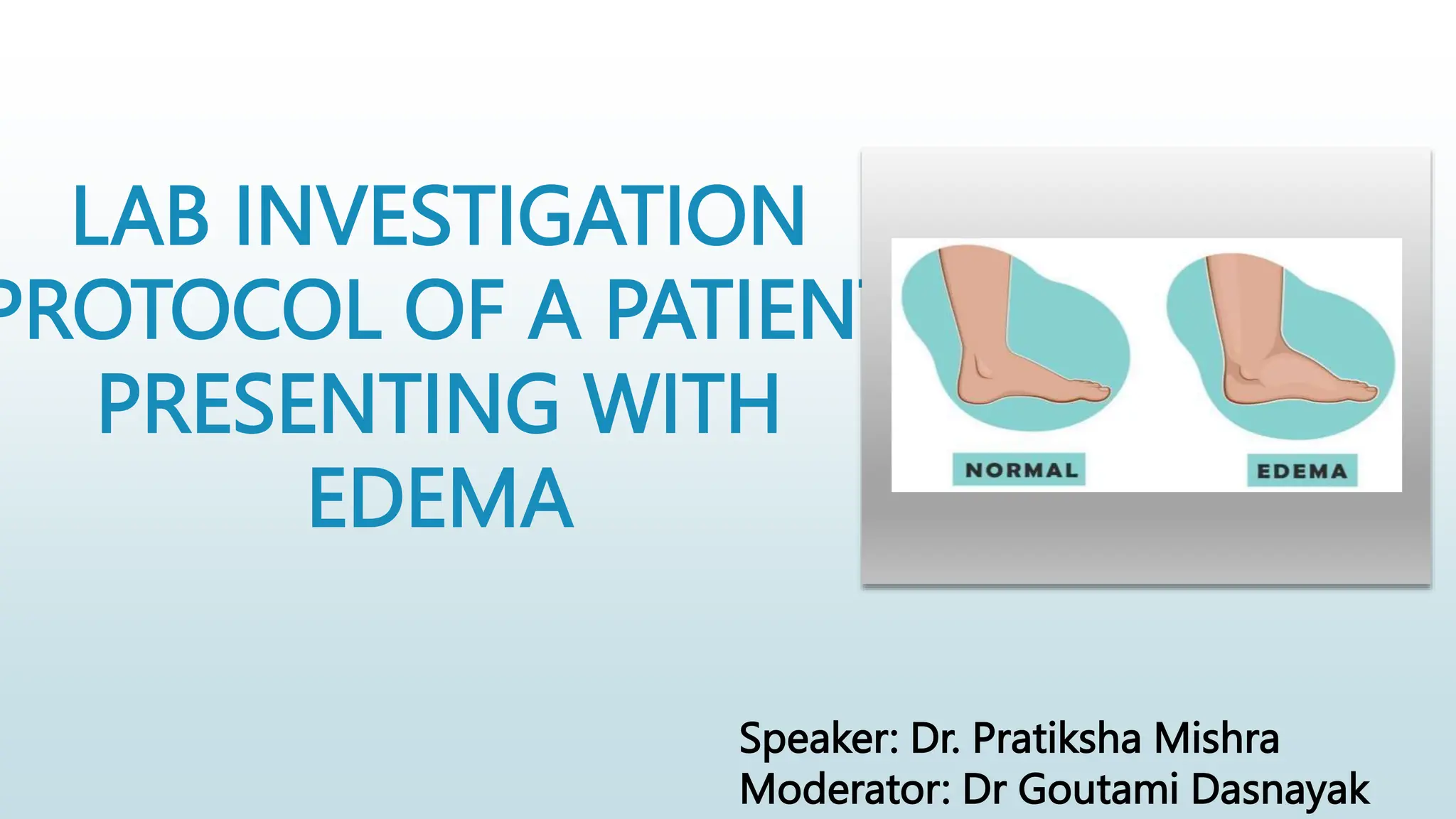 Laboratory investigation of a patient presenting with edema should include tests to identify potential underlying causes. A complete blood count, renal function tests, liver function tests, serum protein and albumin levels, lipid profile, and thyroid function tests can help detect issues like kidney disease, liver disease, malnutrition, or hypothyroidism. Additional tests like chest x-ray, electrocardiogram, brain natriuretic peptide, D-dimer, ultrasound of the abdomen and pelvis, Doppler study, lymphoscintigraphy, and echocardiogram can help diagnose causes such as congestive heart failure, deep vein thrombosis, or lymphatic abnormalities. Together, these lab tests aim to determine the cause and guide treatment of the