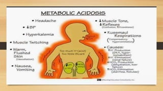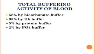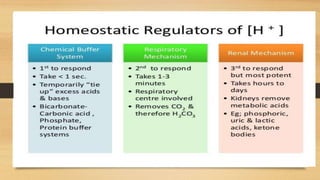 2. The two main buffer systems that help regulate pH - the bicarbonate buffer system and protein buffers. The Henderson-Hasselbalch equation describes the relationship between bicarbonate, carbonic acid and pH.