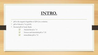 This document provides an overview of the pathophysiology of pH and acid-base homeostasis. It discusses: