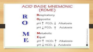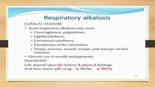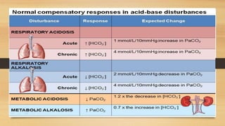 4. The classifications of acid-base disturbances including respiratory and metabolic acidosis/alk