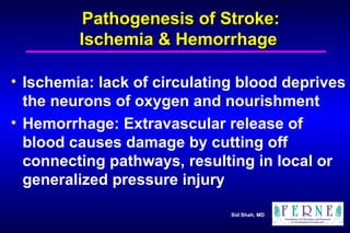 Pathogenesis of Stroke:Ischemia & Hemorrhage Ischemia: lack of circulating blood deprives the neurons of oxygen and nourishment Hemorrhage: Extravascular release of blood causes damage by cutting off connecting pathways, resulting in local or generalized pressure injury