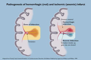 Factors Associated WithRed Infarcts (Hemorrhagic Transformation) Size of the infarct - bigger infarcts have a higher chance of becoming hemorrhagic Richness of collateral circulation Use of anti-coagulants Treatment with thrombolytic agents