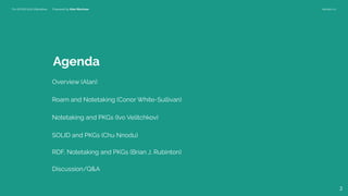 The document outlines the agenda and goals for a workshop focused on personal knowledge graphs (PKGs) at KGC2021, emphasizing their potential and current challenges. It aims to foster discussion around improving usability, integrating mathematics, and supporting decentralized data protection. Key topics include the definition of PKGs, networked notetaking, and the importance of semantics and relationships in knowledge representation.