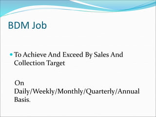 The document outlines the roles and responsibilities of a Business Development Manager (BDM). It discusses achieving sales targets, characteristics of successful vs unsuccessful BDMs, skills needed like active listening and product knowledge, and creating a daily plan with priorities and time management. The goals are to meet incentives, have career growth, and find success, rewards, and high self-esteem by reaching milestones and surpassing sales targets.