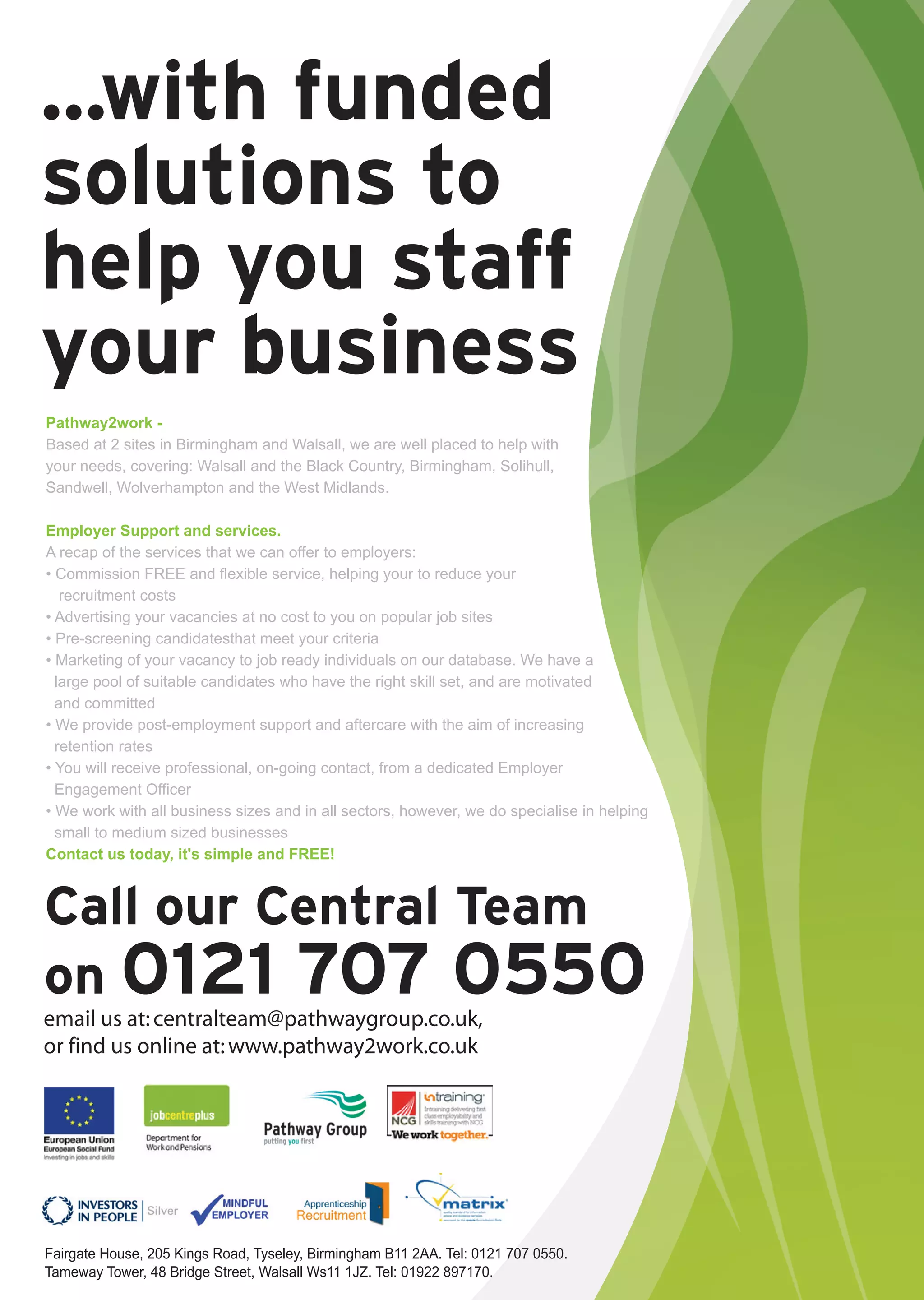 Pathway2work offers a range of commission-free recruitment services for employers in Birmingham, Walsall, and the surrounding West Midlands. Services include advertising job vacancies at no cost, pre-screening candidates, and providing post-employment support to enhance retention rates. The organization focuses on supporting small to medium-sized businesses and encourages employers to reach out for assistance.