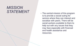 This document provides information about the Pathways Senior Center & Human Services program. The central mission is to provide social outings for seniors to interact and socialize with peers while social workers assist with financial, health, and other issues. Contingency theory recognizes there is no single right way to run an organization and stresses both the external environment and internal functions of different departments. The budget outlines anticipated costs including licenses, accounting fees, rent, utilities, equipment, supplies, and staff pay of $17 or more per hour. Progress will be evaluated through surveys, quantitative data on client progress, and data on service needs used and costs.