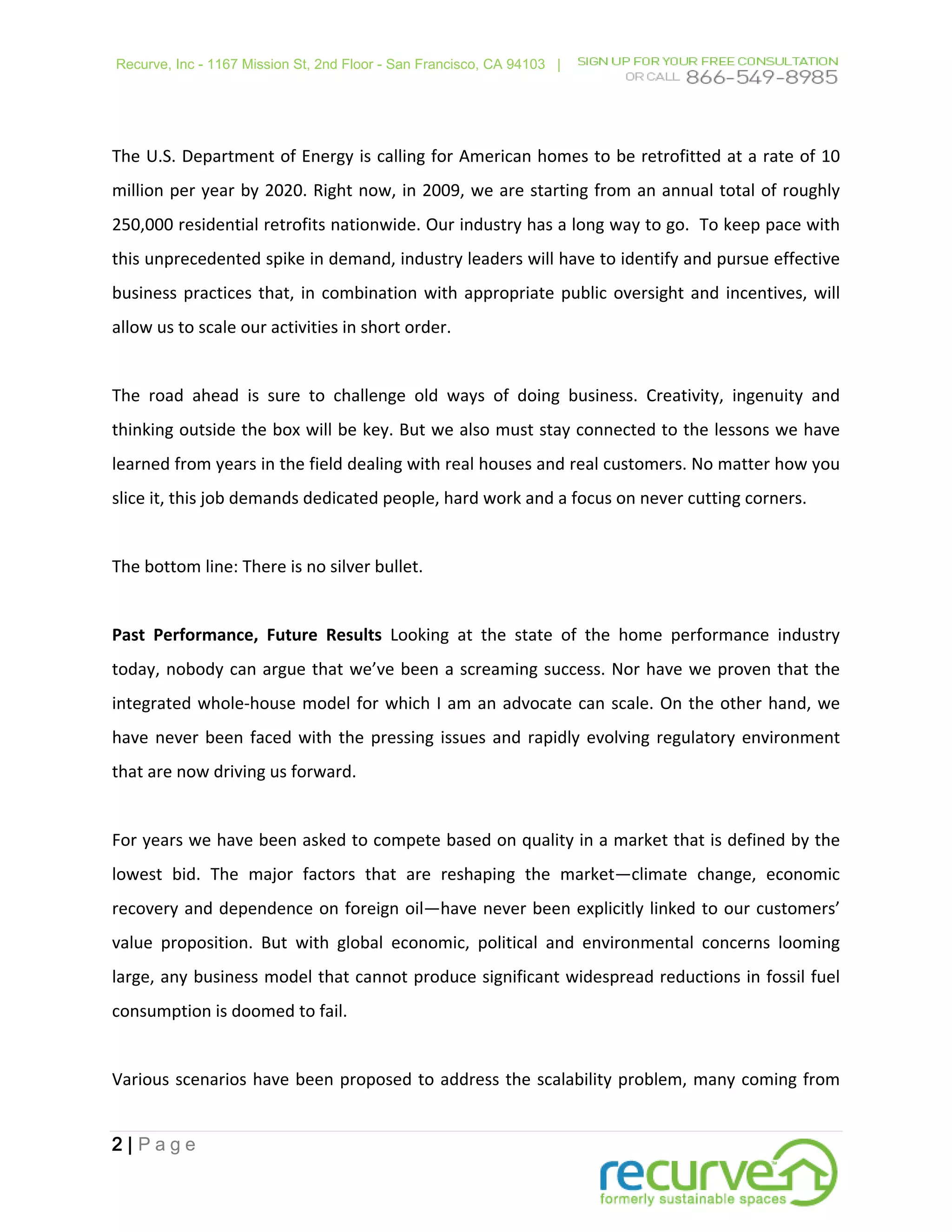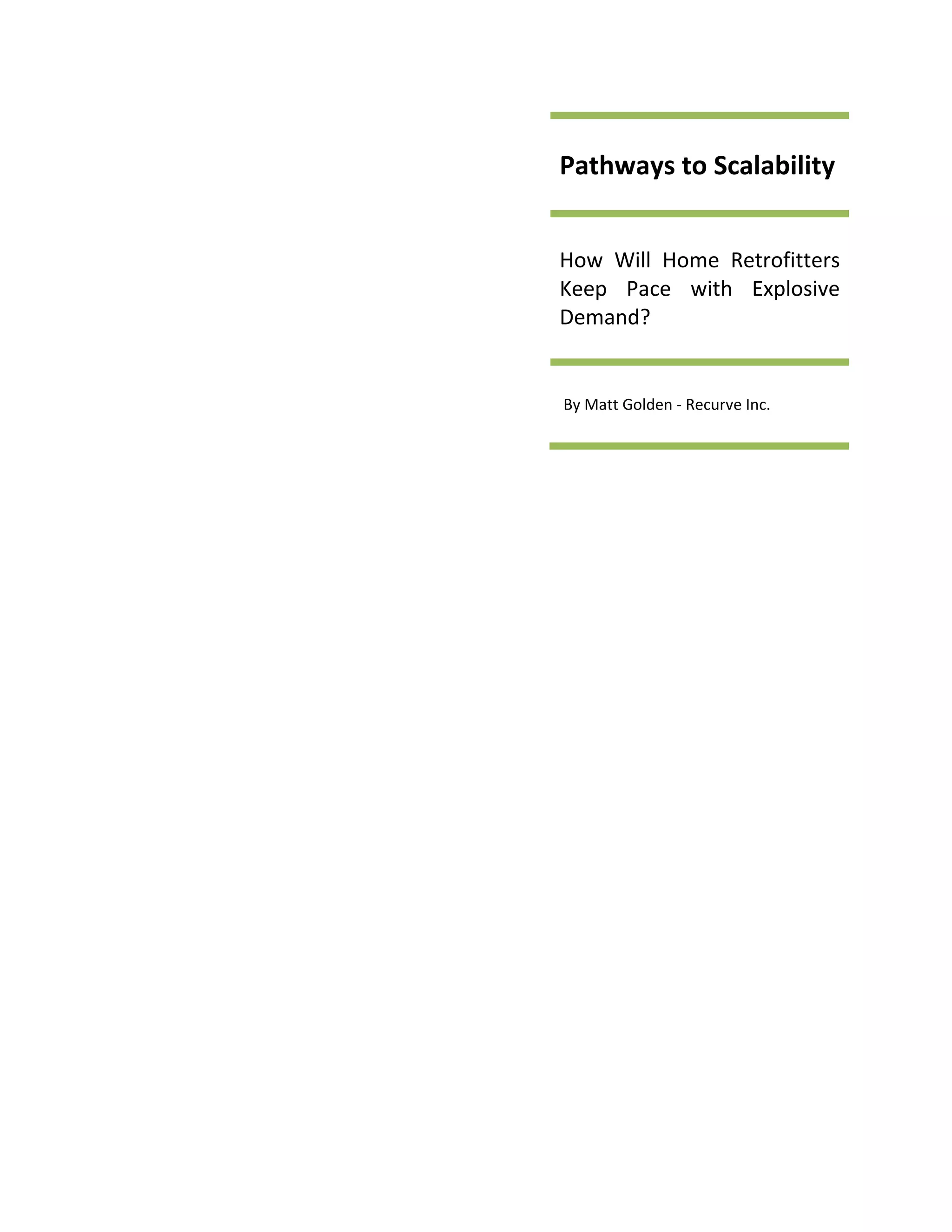 The document discusses the challenges and strategies for scaling home retrofitting efforts in the U.S. to meet a government target of 10 million retrofits annually by 2020, starting from 250,000 in 2009. It critiques various proposed models for achieving this scalability, emphasizing the need for effective business practices, public incentives, and maintaining quality service. The author advocates for a performance-based, standards-oriented approach that includes incentives and financing to support widespread adoption of energy-efficient retrofitting, ensuring a sustainable industry that can address climate and energy goals.