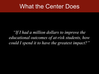 The Center for High Impact Philanthropy outlines strategies to improve educational outcomes for at-risk students across various phases of education, from early childhood to postsecondary. It emphasizes a multi-perspective, evidence-informed approach that includes research and expert insights to tackle barriers faced by students, enhancing their readiness and success. Case studies, such as the DOE initiative, demonstrate how targeted investments and community partnerships can lead to significant improvements in student achievement and graduation rates.