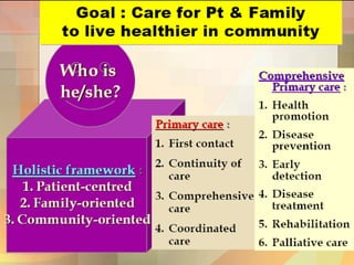 องค์ประกอบของกระบวนการดูแล โดยให้ผู้ป่วยเป็นศูนย์กลางมีอะไรบ้าง สืบค้นทั้งโรค ( disease) และความเจ็บป่วย (illness) ไปพร้อมๆ กัน ทำความเข้าใจกับความเป็น “ คน ” ของผู้ป่วย หาแนวทางร่วมกันในการดูแลสุขภาพ ผสมผสานการป้องกันโรคและสร้างเสริมสุขภาพ ส่งเสริมความสัมพันธ์ที่ดีระหว่างแพทย์กับผู้ป่วย ตั้งอยู่บนพื้นฐานของความเป็นจริง ที่มา : สายพิณ หัตถีรัตน์ (2549) คู่มือหมอครอบครัวฉบับสมบูรณ์ . Stewart M. et al. (2003) Patient-Centered Medicine: Transforming the Clinical Method.