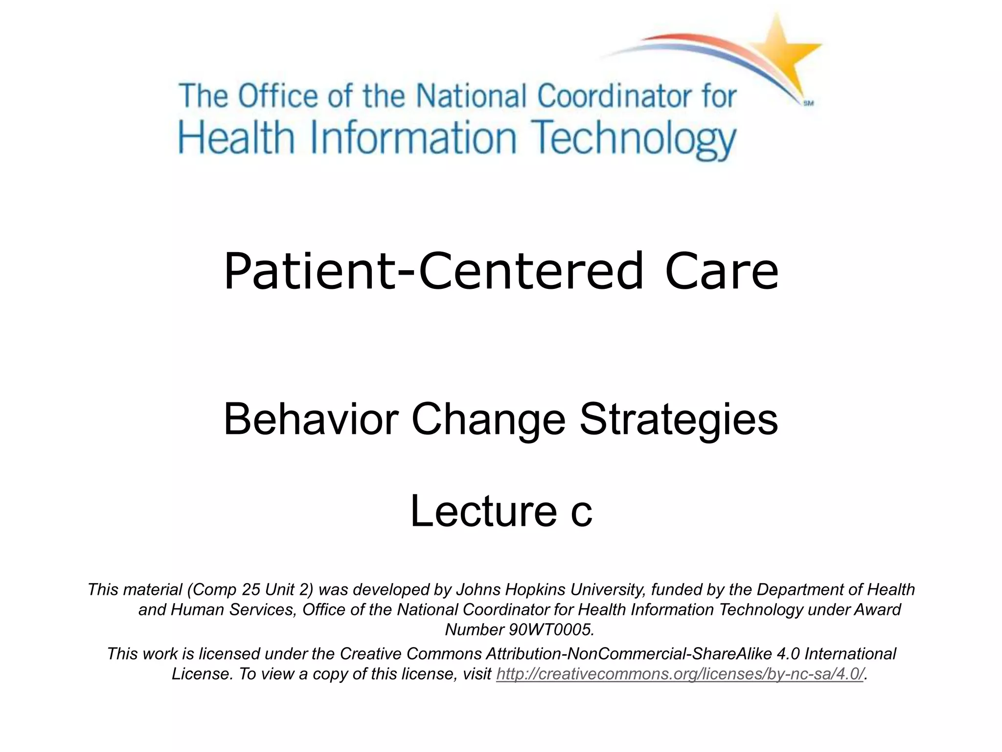 This lecture discusses strategies for designing patient-centered behavior change interventions. It provides an overview of tools and sources for patient engagement, including community programs, organizational strategies, healthcare team approaches, and individual-level activities. The lecture also covers areas to measure patient engagement and the role of mobile technologies and patient portals in supporting chronic disease management and population health improvement.
