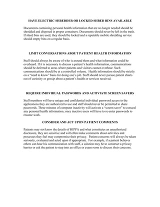 This document discusses strategies for protecting patient privacy and confidentiality. It recommends performing regular privacy audits to identify vulnerabilities, training staff on HIPAA regulations, securing computers and paper records, limiting discussions of sensitive health information, using individual passwords and screen savers, and considering patient feedback to ensure privacy is maintained. Protecting patient confidentiality is essential for building trust between healthcare providers and patients.