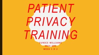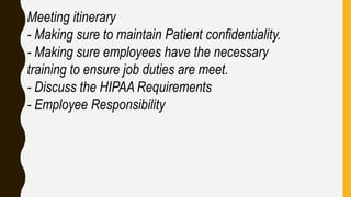 The document discusses patient privacy training for employees. It outlines that the training will cover maintaining patient confidentiality, ensuring employees have necessary training to fulfill job duties, and discussing HIPAA requirements and employee responsibilities. The training will also cover patients' privacy rights under HIPAA regulations including rights to access, accounting of disclosures, amendment, confidential communications and more. The document states that HIPAA training will be provided to all new employees and on a quarterly basis, and will include signing off that regulations are understood and scenarios to ensure comprehension.