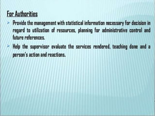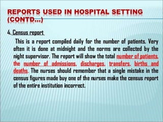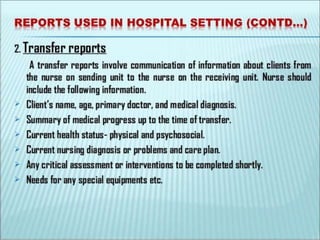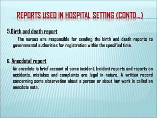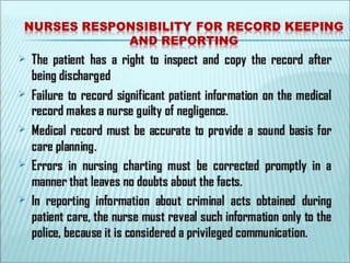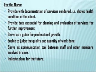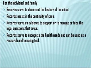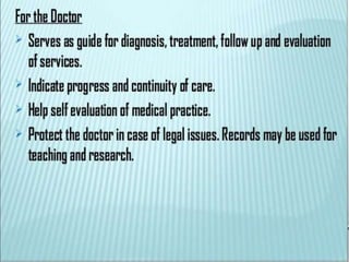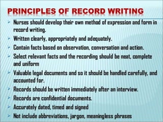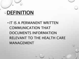 The document discusses patient record systems, including their definition, principles, value, purpose, importance, and classifications. It covers paper-based and electronic documentation systems. Paper-based systems can use source-oriented, problem-oriented, or graphic methods. Electronic systems include electronic medical records, electronic health records, and computerized patient records. The objectives of patient record systems are to review patient care, provide an archival record, support research, and facilitate administration and auditing. Both paper-based and electronic systems aim to properly document a patient's condition and care over time.