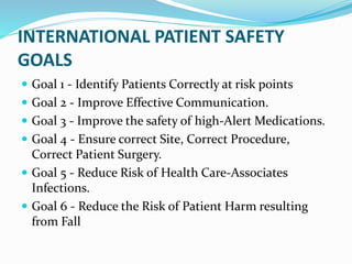 The document outlines international patient safety goals and guidelines for incident reporting. It discusses 6 main safety goals, including correctly identifying patients, improving communication, and reducing healthcare-associated infections. It also defines different types of incidents like near misses, adverse events, and sentinel events. For reporting, it specifies the immediate actions required and that all incidents must be reported to the quality department within 24 hours. The purpose is to distinguish between different adverse events to improve patient safety.