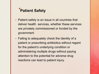 The document discusses the importance of patient safety in healthcare, highlighting issues such as medication errors caused by look-alike and sound-alike medications and the risks associated with high alert medications. It outlines best practices for safe handling, administration, and monitoring of medications to prevent adverse events. Additionally, the document emphasizes the need for effective communication among healthcare providers and the importance of training for safe medication practices.