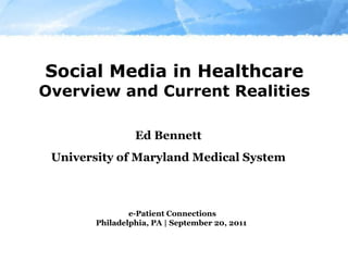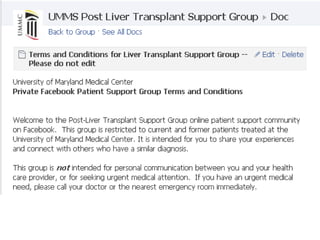 Social media is increasingly used in healthcare for customer service, community outreach, education, and public relations. Hospitals use platforms like YouTube and Twitter, but must consider HIPAA privacy laws and managing professional online identities. Patient support groups on Facebook have been created by some hospitals, including the University of Maryland Medical Center, to provide a restricted space for patients to connect over shared health topics and experiences in a moderated environment. These groups see varying levels of engagement from members discussing health issues and organizing offline meetups.