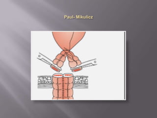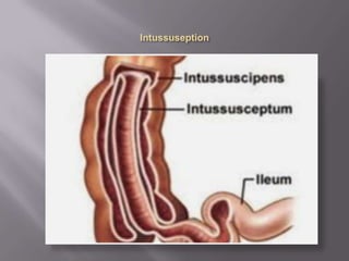 This document discusses bowel obstruction, including its classification, signs and symptoms, causes, and management. It classifies obstruction as paralytic or mechanical, and mechanical obstruction as acute or chronic, by site (high or low), nature (simple or strangulated), and etiology. Signs of bowel obstruction include abdominal pain, distension, constipation, and vomiting. Causes include hernias, adhesions, tumors, and fecal impaction. Management involves fluid resuscitation, nasogastric decompression, and surgery if conservative measures fail or for strangulating obstructions.
