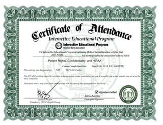 This document certifies that [name] has completed a 1-hour continuing medical sales education course on patient rights, confidentiality, and HIPAA. The course took place on March 6, 2015. While the certificate can be submitted for vendor credentialing, some hospitals may not accept the certification. Participants should only claim credit for the extent of their participation in the activity.