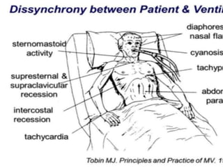 This document discusses patient-ventilator dyssynchrony, which occurs when a patient's respiratory demands are not appropriately met by the ventilator. This can increase the patient's work of breathing, lead to distress, and prolong the need for ventilation. Dyssynchrony can be caused by inappropriate ventilator settings, modes where the patient is fighting the ventilator, or issues like auto-triggering. Identifying the type and cause of dyssynchrony is important to optimize ventilator support and improve the patient experience.