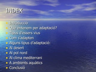 INDEX Introducció Queentenem per adaptació? Tipus d’essers vius Com s’adapten Alguns tipus d’adaptació : Al desert Al pol nord Al clima mediterrani A ambients aquàtics Conclusió