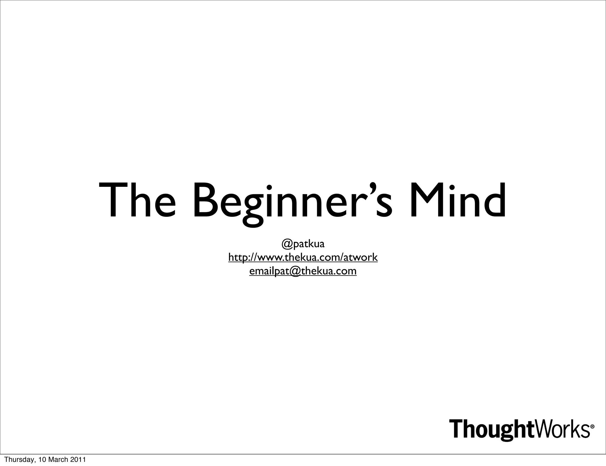 The document discusses maintaining a beginner's mindset and avoiding the pitfalls of expertise. It describes the Dreyfus model of skill acquisition, which shows how experts' perspectives become narrow. It provides tips for experts: remain a novice in some areas, ask questions to challenge assumptions, stay curious by learning from diverse groups, and be aware of cognitive biases. Maintaining a beginner's mindset helps avoid overconfidence and keeps more possibilities open.