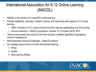 The document outlines the vision for next generation learning and competency education, emphasizing personalized and blended learning environments that leverage technology to enhance education accessibility and quality. It highlights global trends and initiatives in online learning, including efforts in countries like India, China, and South Korea, and the importance of competency-based approaches. Additionally, it discusses the need for policy changes to support innovative educational practices and ensure equitable access for all students.