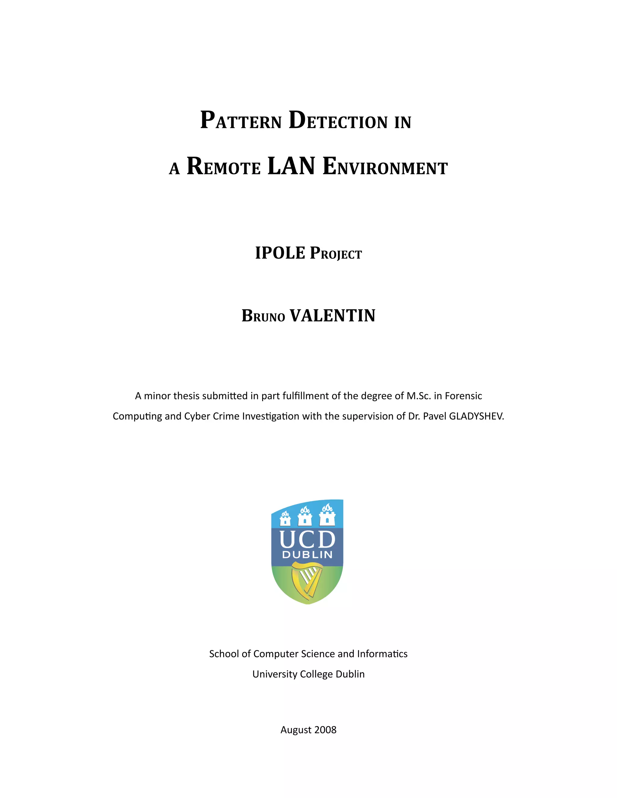 This minor thesis by Bruno Valentin discusses the development of a pattern detection system for internet cafes to aid law enforcement in identifying criminals who exploit anonymity to commit offenses. The proposed solution involves a network of probes monitoring traffic and reporting real-time alerts to police, enabling swift action without relying on third-party information. The document evaluates existing solutions, outlines the system's architecture, and presents its effectiveness in addressing law enforcement challenges related to cybercrime.