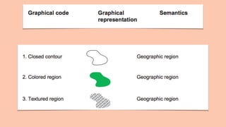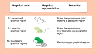 The document discusses principles of pattern perception and map design. It covers Gestalt's laws of proximity, similarity, connectedness, continuity, symmetry, closure, and relative size. It then discusses representing vector fields through showing direction, magnitude, and orientation. It also discusses the perceptual syntax of diagrams through creating nodes and relationships. Finally, it discusses the visual grammar of maps through using contours, textures, colors, and lines to represent geographic regions, paths, and point entities.