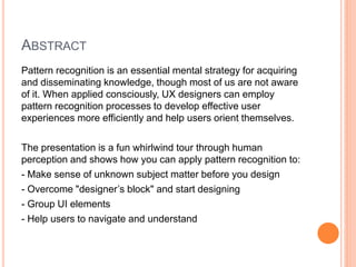 Pattern recognition is an essential human mental process for acquiring and sharing knowledge. While unconscious for most people, conscious use of pattern recognition can help UX designers develop more effective user experiences efficiently. The presentation discusses how pattern recognition works in both bottom-up and top-down ways. It provides advice on applying pattern recognition to make sense of new subjects, group UI elements, and help users navigate interfaces. The key messages are that pattern recognition is context dependent and some patterns are difficult to recognize, so the process requires balancing bottom-up exploration with top-down expectations.