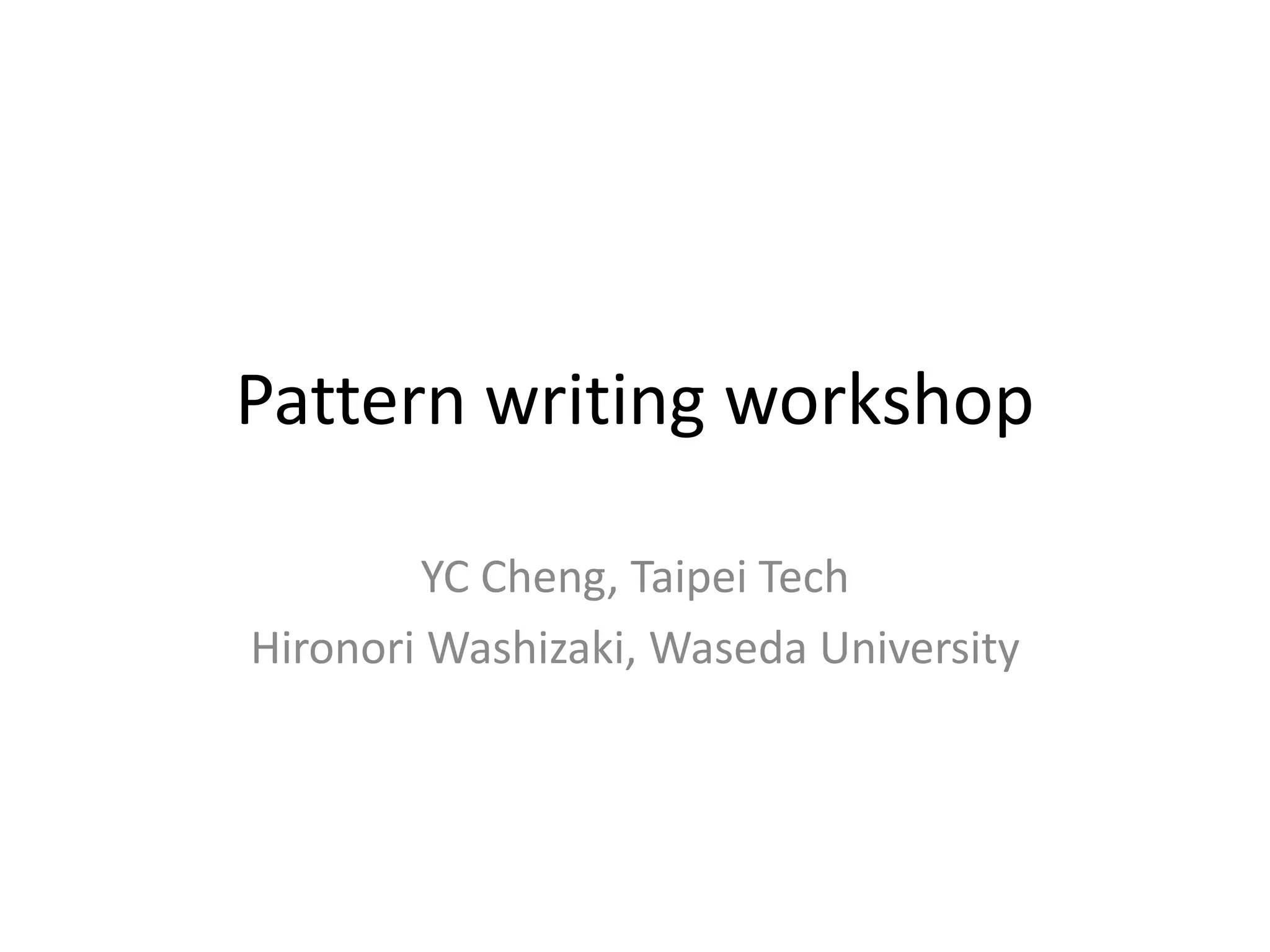 The document outlines a pattern writing workshop focused on identifying problems and solutions for agile teams, emphasizing the contexts of workspace arrangement and family meal preparation. Two specific problems are presented: optimizing an agile team's workspace for better communication and reducing reliance on external food for a working family. The workshop structure includes iterations for understanding contexts, collaborative work, and reflection on improvements.