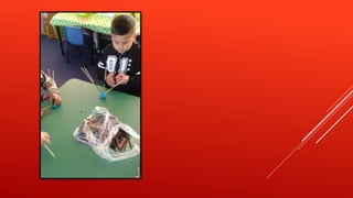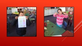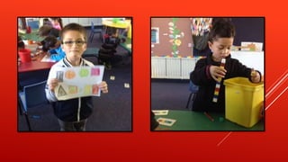 The document describes activities that a classroom did to practice making repeating patterns. The students used connecting blocks, drew around shapes, used sticks and colored straws, and beads to create patterns. They listed examples of patterns they made using colors like red, yellow, blue and green in a repeating order. The students enjoyed making patterns in different ways, including on an iPad, and links to online pattern activities are provided.