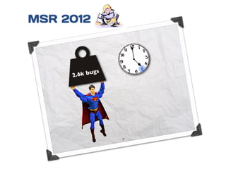 The document discusses strategies for cleaning up bug data, focusing on two main patterns: identifying mass updates in bug reports and determining which reports are too recent to be classified. It explains how to analyze changes in bug reports, discard irrelevant mass updates, and estimate the age and reliability of reports before further analysis. Proper data cleaning is emphasized as crucial for accurate insights into software quality.