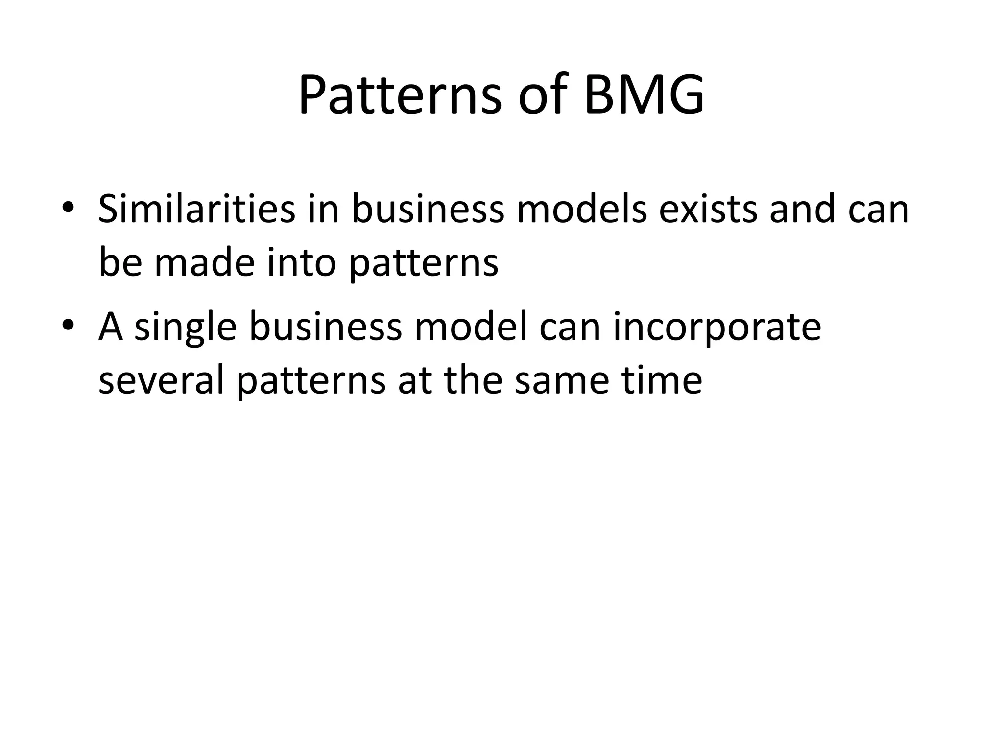 This document discusses several patterns of business models that can be identified. It describes the pattern of unbundling, where a business is divided into customer relationship, product innovation, and infrastructure areas. It also outlines the long tail pattern of selling many niche products in small quantities. Another pattern is the multi-sided platform that connects different user groups. The document examines free business models where one user group subsidizes another. Finally, it introduces the open business model pattern of collaborating systematically with external partners.