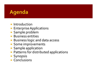 The document discusses software design patterns for distributed applications. It introduces common patterns like Model-View-Controller (MVC), layers (presentation, business, data), and data access patterns (table data gateway, active record). It also provides examples of applying these patterns to problems like representing business entities and data, handling distributed transactions, and implementing specific business logic like revenue recognition. The goal of patterns is to provide reusable solutions to common problems in software architecture and design.