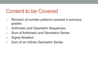 The document discusses arithmetic and geometric sequences and series. It defines arithmetic and geometric sequences, and provides the formulas for calculating the nth term of each type of sequence. Specifically, it states that the formula for the nth term of an arithmetic sequence is Tn = a + (n-1)d, where a is the first term and d is the common difference. The formula for the nth term of a geometric sequence is Tn = arn-1, where a is the first term and r is the common ratio. The document also provides examples of using these formulas to find terms, common differences or ratios, and to write the formulas for given sequences.