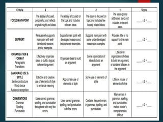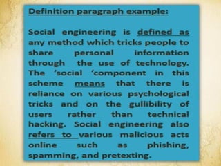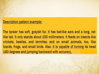 The document outlines various writing patterns including narration, description, definition, classification, exemplification, comparison and contrast, cause and effect, problem-solution, and persuasion, along with their signal words. Each pattern is explained with examples to illustrate how they aid in developing ideas and presenting information effectively. It also includes activities to analyze written texts using these patterns and encourages writing practice based on selected topics.