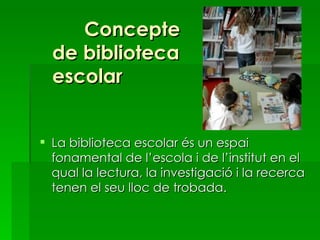 Concepte de bibliotecaescolar La biblioteca escolar és un espai fonamental de l’escola i de l’institut en el qual la lectura, la investigació i la recerca tenen el seu lloc de trobada.
