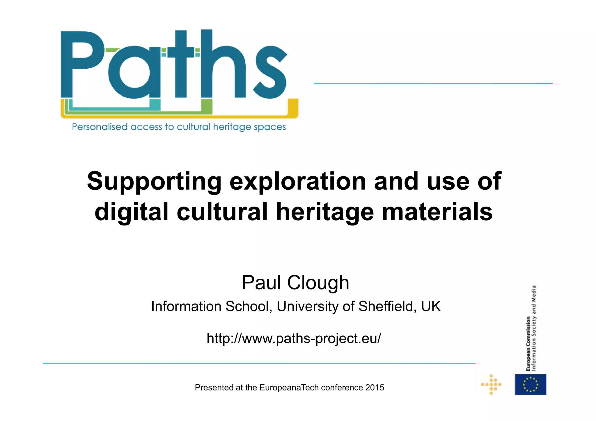 The document discusses the PATHS project, which aimed to develop techniques to help both expert and non-expert users navigate and understand cultural heritage materials from Europeana. The project performed semantic enrichment on over 1.7 million records to enable searching and browsing. It also investigated using "paths" or trails through digital collections as guides and learning aids. The resulting PATHS system supported various aspects of information seeking and sense-making using interface components tailored for desktop and mobile devices.