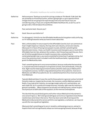 The Affordable Healthcare Act and proposed changes to Medicaid funding will significantly impact the long-term care industry and seniors. Block grants that reduce Medicaid reimbursement to states would dramatically cut funding for nursing home services as over 50% of patients rely on Medicaid. With already slim margins under 5% on average, further reimbursement reductions could force some nursing homes to close. This would jeopardize care for patients who require 24-hour nursing care and have no alternative living arrangements. Advocates encourage families to write their legislators to preserve Medicaid funding for elderly care.