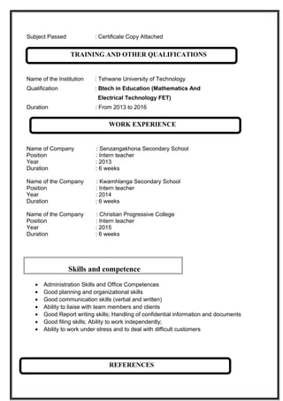 Paulos Jabulani Ngoma's curriculum vitae provides information about his personal details, qualifications, skills, work experience and references. He holds a BTech in Education with a specialization in Mathematics and Electrical Technology from Tshwane University of Technology. His work experience includes 6 week internships as a teacher at three different schools between 2013-2015. He has good administrative, planning, communication and report writing skills. His references include contacts from TUT, two previous schools and employers that can be contacted about his work and qualifications.