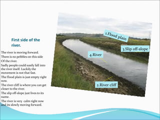 The document contains a student's geography homework assignment about observing different sides of the River Ouse. It notes characteristics like vegetation, terrain features, and water speed on each side. It also includes information about the formation of the Ouse and Adur Rivers Trust and their water quality testing, habitat preservation work, and guided riverside walks along the river.