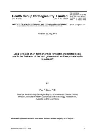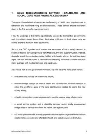This document discusses priorities for health and social care reform in Australia. It argues that current boundaries between healthcare, long-term care, and retirement living are unsustainable. It also claims that payment systems for doctors and hospitals are outdated and impede integrated care. The document advocates for breaking down barriers between health and social care systems, changing payment incentives to focus on quality over quantity of care, and strengthening the linkage between medical and social care.