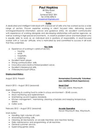 This document provides a profile and resume for Paul Hopkins. It summarizes his work history including roles as a head chef, arcade operator, customer service assistant, and founder of his own employment support project. It lists his skills such as experience in various sectors including housing, retail, and hospitality. It also outlines his education and training qualifications as well as noting his hobbies include being an active community volunteer and member of resident groups.