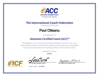 Paul Olteanu served as the ICF Global Board Chair from 9/5/2016 to 12/31/2019. During this time period, he held the position of ICF Executive Director as well. Paul provided leadership to ICF as both the Board Chair and Executive Director for over three years.