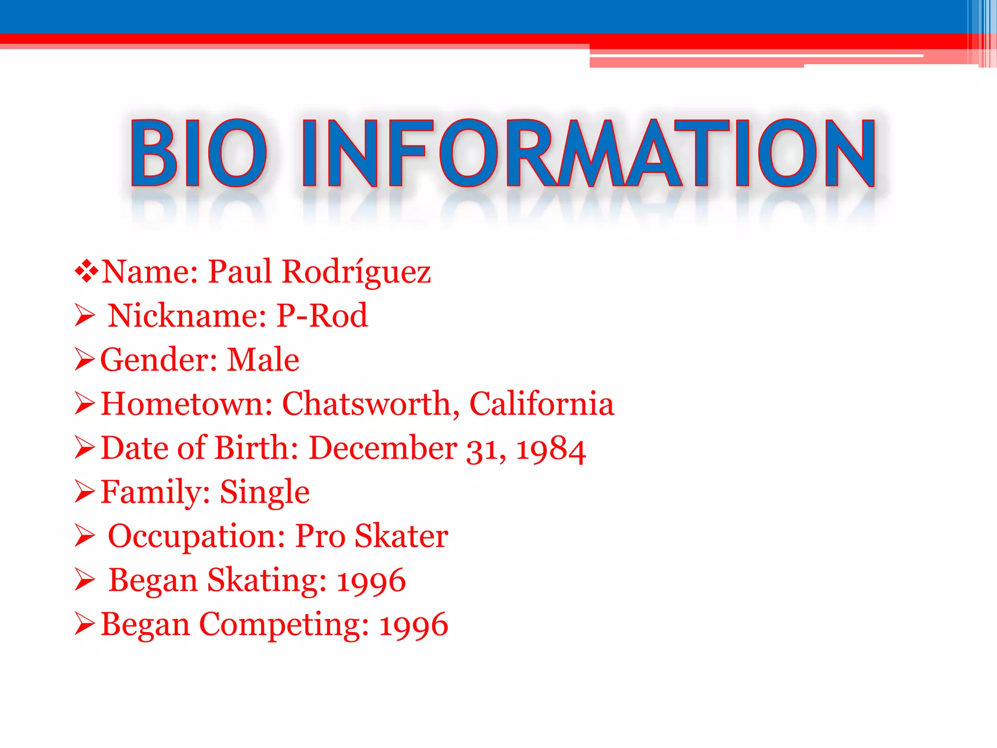 Paul Rodriguez Jr. is a professional skateboarder from Chatsworth, California. Some of his career highlights include becoming the first pro skater sponsored by Nike in 2004 and winning gold at the X Games in both 2004 and 2005 for street skating. He began skating at age 12 when his famous comedian father Paul Rodriguez bought him his first board. Paul has appeared in movies and television shows in addition to his skating career. He is known for his relaxed and consistent style on a skateboard.