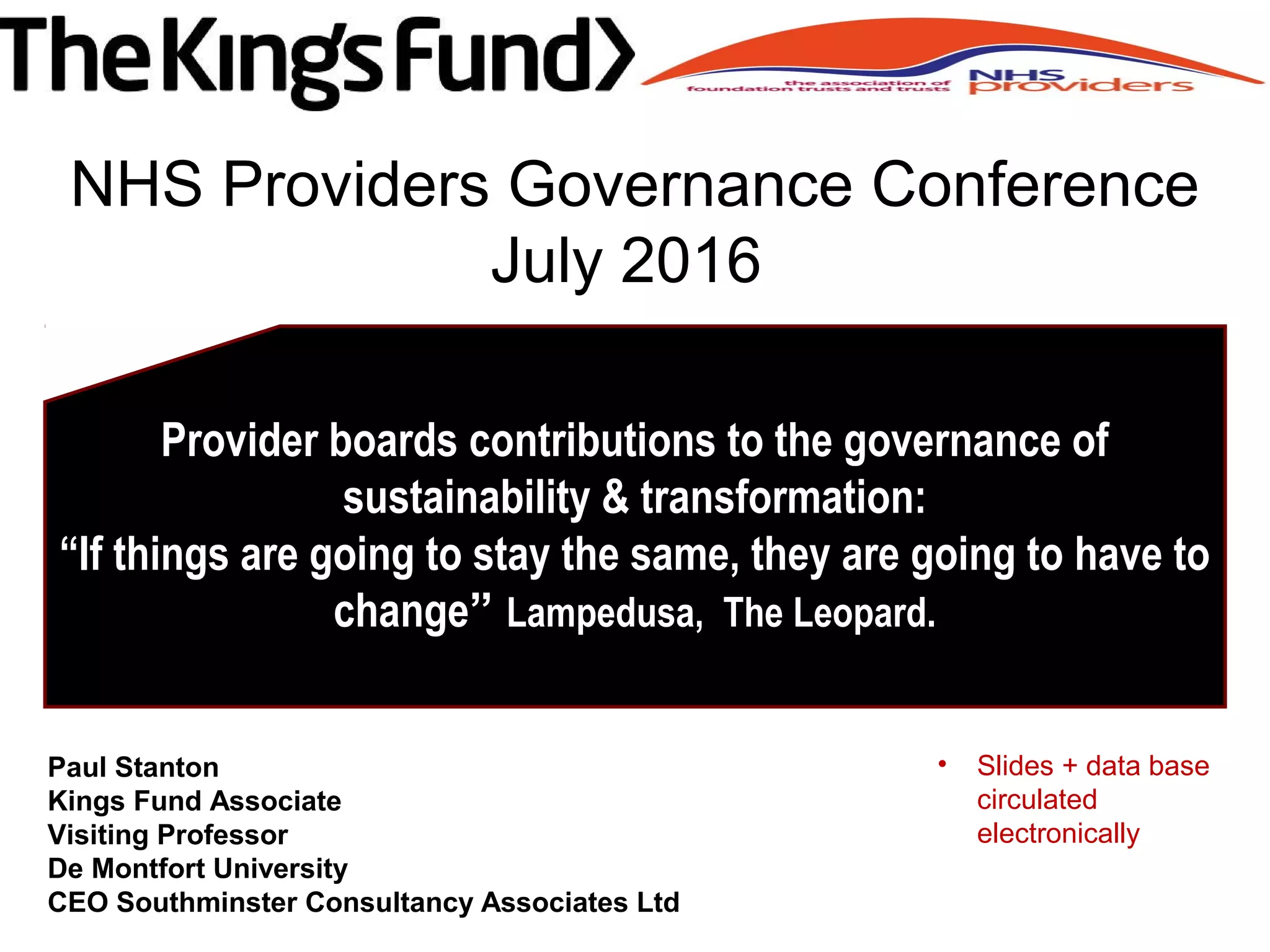 This document discusses the challenges facing the sustainability and transformation of the UK healthcare system. It notes the aging population will significantly increase demand, while austerity and efficiency measures are also needed. Sustainability and transformation plans (STPs) aim to reform models of local care delivery to better meet changing needs. New forms of governance may be needed across organizational boundaries and sectors to enable the collective leadership and system-level cooperation required for transformation. The document emphasizes the need for a patient-centered approach and accountability to the public as the healthcare system evolves.