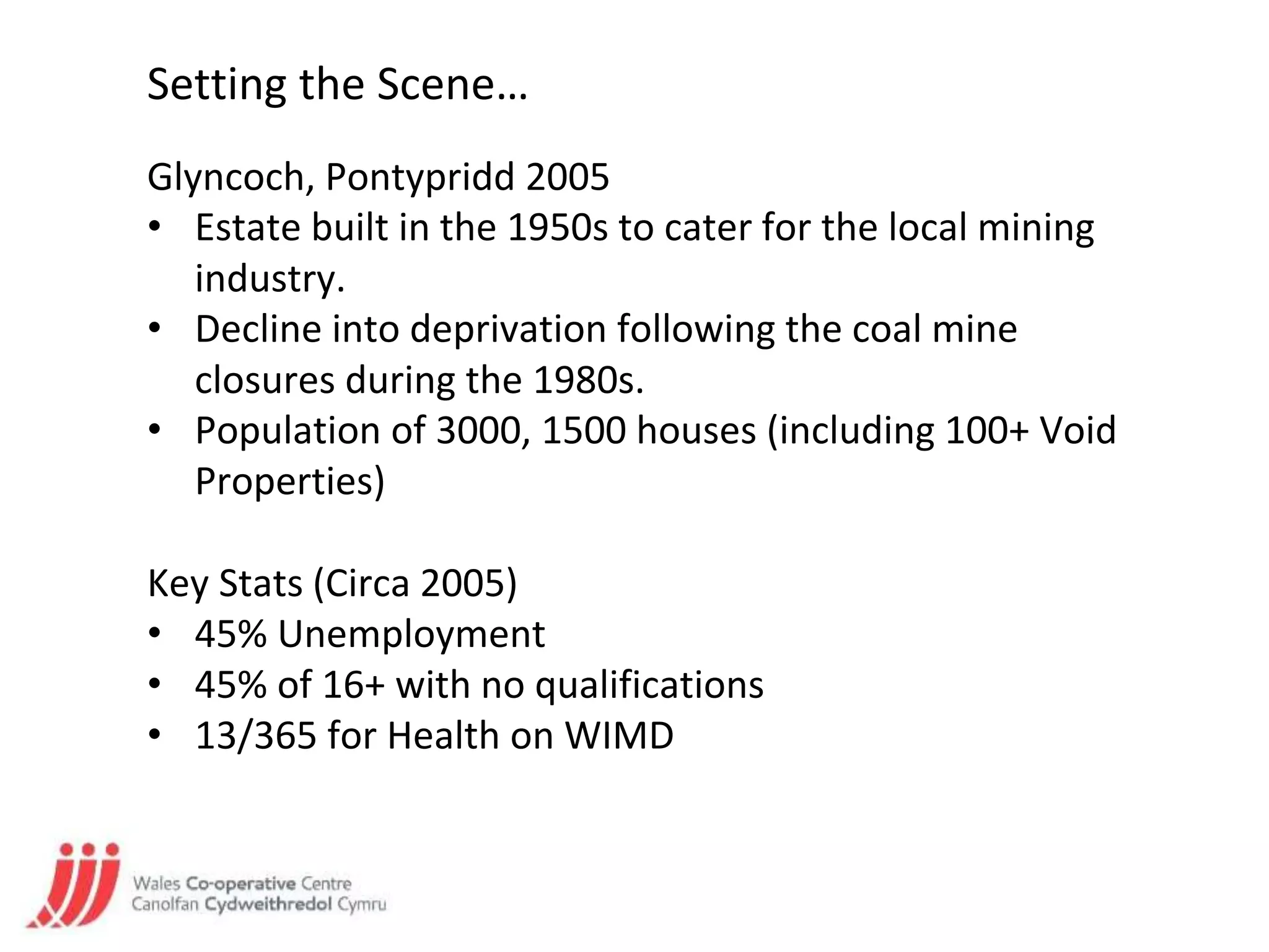 The document discusses the Sustainable Livelihoods Approach (SLA) in Glyncoch, Wales, highlighting its role in asset-based community development amidst economic challenges following the coal mine closures in the 1980s. The approach emphasizes empowering individuals by identifying and utilizing their existing assets, which has led to significant community improvements, such as increased educational qualifications and the establishment of local regeneration initiatives. By 2014, the perception of living in Glyncoch improved notably, demonstrating the effectiveness of SLA in fostering community resilience and collaboration.