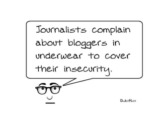 The document discusses the blurring line between journalism and blogging. It outlines the traditional roles of journalists in verifying facts, providing context, and analyzing stories compared to bloggers who can crowdsource accuracy and change content freely. Both can disseminate news but journalists adhere to standards of verification and detachment while bloggers have more freedom in style and engagement. The document argues the definition of a journalist depends more on their acts than their title and advocates for guidelines focused on freely sharing information, accountability, independence and minimizing harm while serving the public.